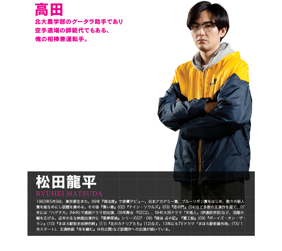 三枚目なようで、キメるところはビシっとキメる。ご存知ススキノの探偵を演じるのは言わずもがな、大泉洋。今作では危険なアクションのみならず、濃厚なラブシーン(!?)まで披露。男の色気全開でスクリーンに返り咲く!そんな探偵の相棒兼運転手・高田には、これまたご存知、松田龍平。喧嘩は異常に強いが、スキあらば眠ろうとするマイペースぶりは今回も健在だ。微妙にかみ合わない2人が魅せる絶妙なコンビネーションは、〈調査〉も〈期待〉も外さない!
