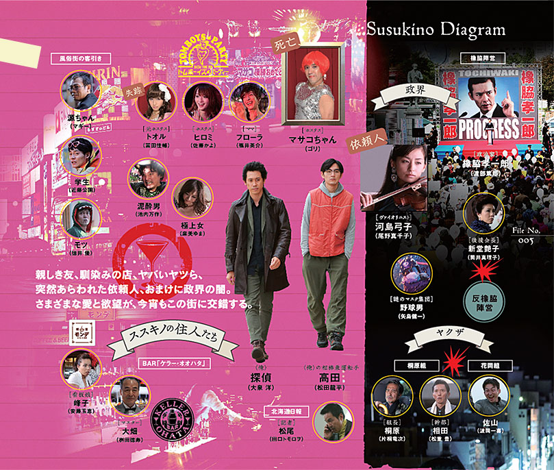 今回の“依頼人”となるヒロイン・弓子を演じるのは尾野真千子。事件の鍵を握る政治家・橡脇には渡部篤郎。さらに事件の発端となる友人・マサコちゃん役のゴリをはじめゲスト陣、レギュラー陣ともに個性派キャストが揃い踏み!原作はもちろん東直己の〈ススキノ探偵シリーズ〉から長編第4作目「探偵はひとりぼっち」。スタッフも当然、前作を大ヒットへと導いた面々が再集結。抜群のチームワークが織りなす世界観に、華を添える豪華キャスト。これぞ娯楽映画の真骨頂!